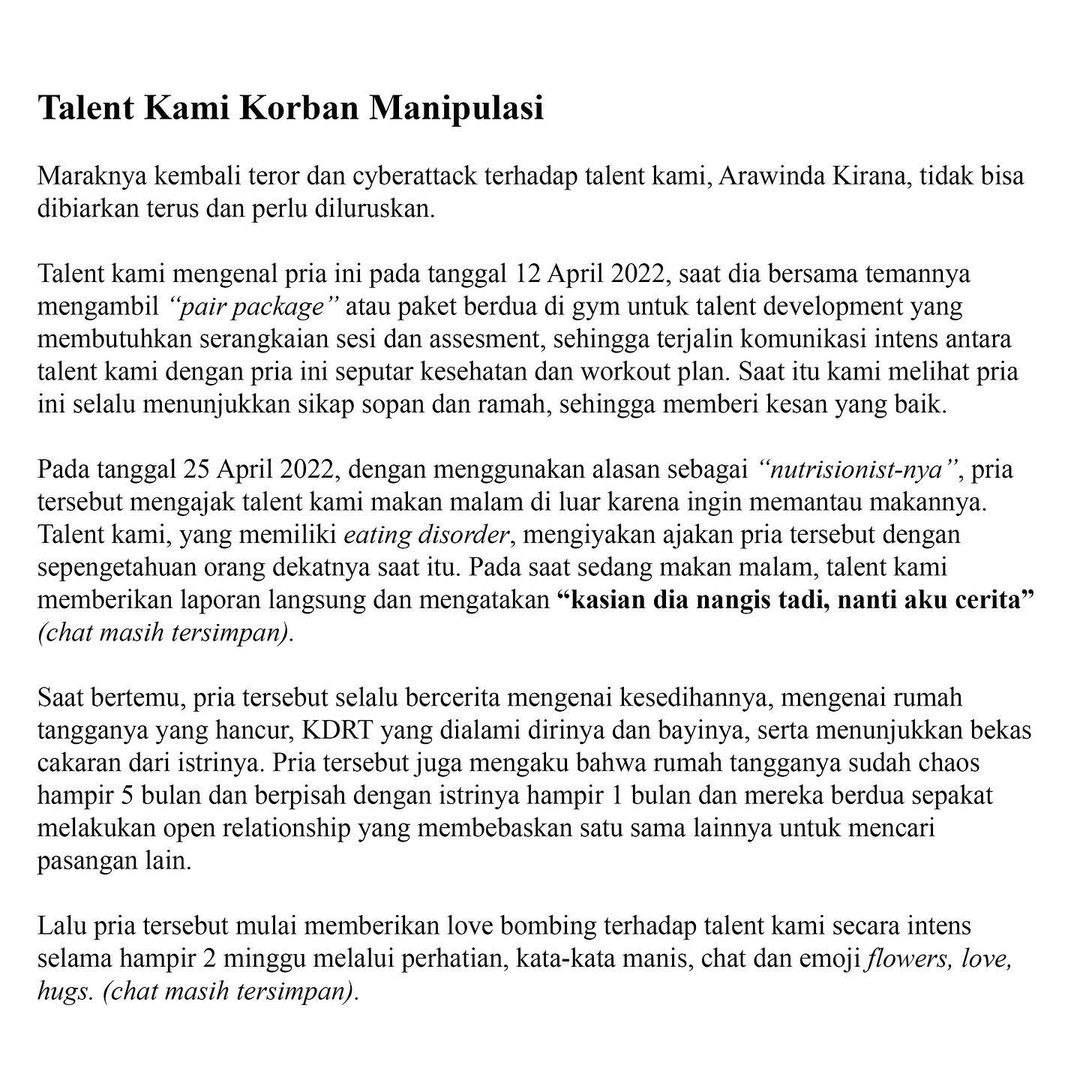 Dan bukannya, “Artis kami sopan, kalo namu ke rumah orang gak pernah lupa copot sendal sama salim, kalo disuguhin makan nggak lupa bantu cuci piring.” Hubungan Arawinda dan KE pada dasarnya sama seperti driver ojol dan operator ojol. Bayangin kalo ada operator ojol tau-tau bikin press release,